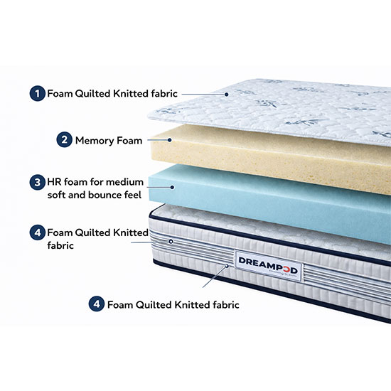 Upgrade your sleep with the Dreampod Ivory Mattress—engineered for the perfect balance of comfort, support, and durability. Designed with premium memory foam cushioning and a high-resilience (HR) foam base, this mattress delivers medium-firm support with a responsive bounce, making it ideal for all sleep positions.